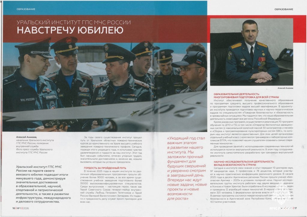 Уральский институт ГПС МЧС России, на пороге своего векового юбилея, подвел итоги минувшего года, демонстрируя значительные достижения в образовательной, научной, спортивной и патриотической деятельности, а также в развитии инфраструктуры, международного и делового сотрудничества. Об этом рассказано в первом выпуске журнала «Пожарное дело» в 2026 году. https://pressa.ru/ru/magazines/pozharnoe-delo#/